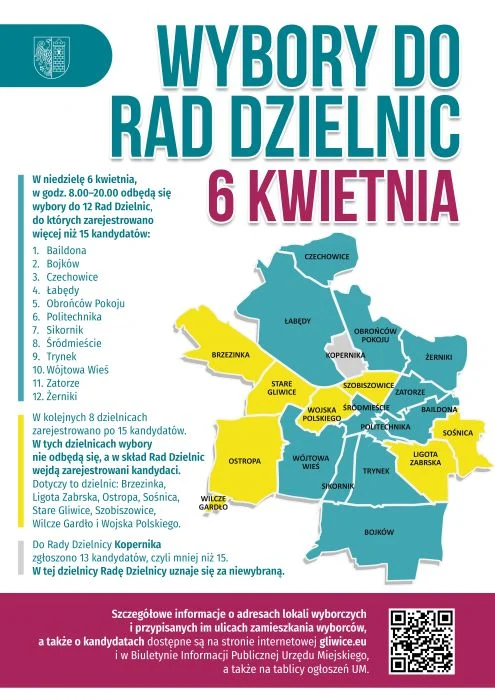 Każda radę dzielnicy tworzyć musi 15 radnych. 6 kwietnia wybory zostaną przeprowadzone w 12 gliwickich dzielnicach, w których kandyduje więcej niż 15 osób: Baildona, Bojków, Czechowice, Łabędy, Obrońców Pokoju, Politechnika, Sikornik, Śródmieście, Trynek, Wójtowa Wieś, Zatorze, Żerniki.