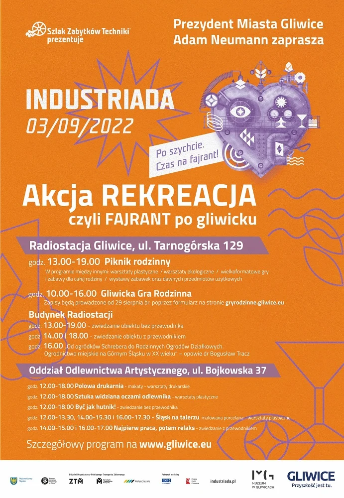 Jest fajrant, jest zabawa! 3 września przy gliwickiej Radiostacji odbędzie się kolejna odsłona największego festiwalu kultury dziedzictwa poprzemysłowego w Europie Środkowo-Wschodniej. Tym razem zapraszamy na wielką AKCJĘ REKREACJĘ, czyli fajrant po gliwicku! Będzie pełna wyzwań Gliwicka Gra Rodzinna oraz piknik rodzinny z mnóstwem atrakcji: warsztatami, miasteczkiem z grami XXL, wystawami, saturatorem i watą cukrową! To będzie wyjątkowa, trzynasta edycja INDUSTRIADY – święta Szlaku Zabytków Techniki.