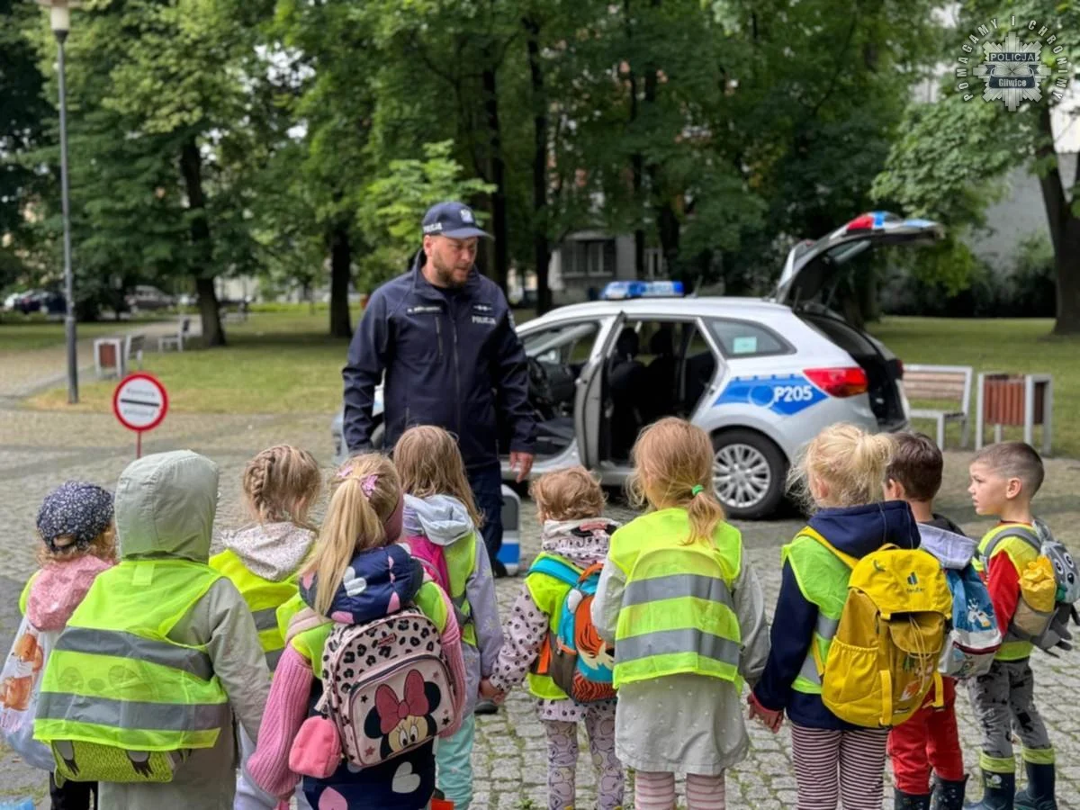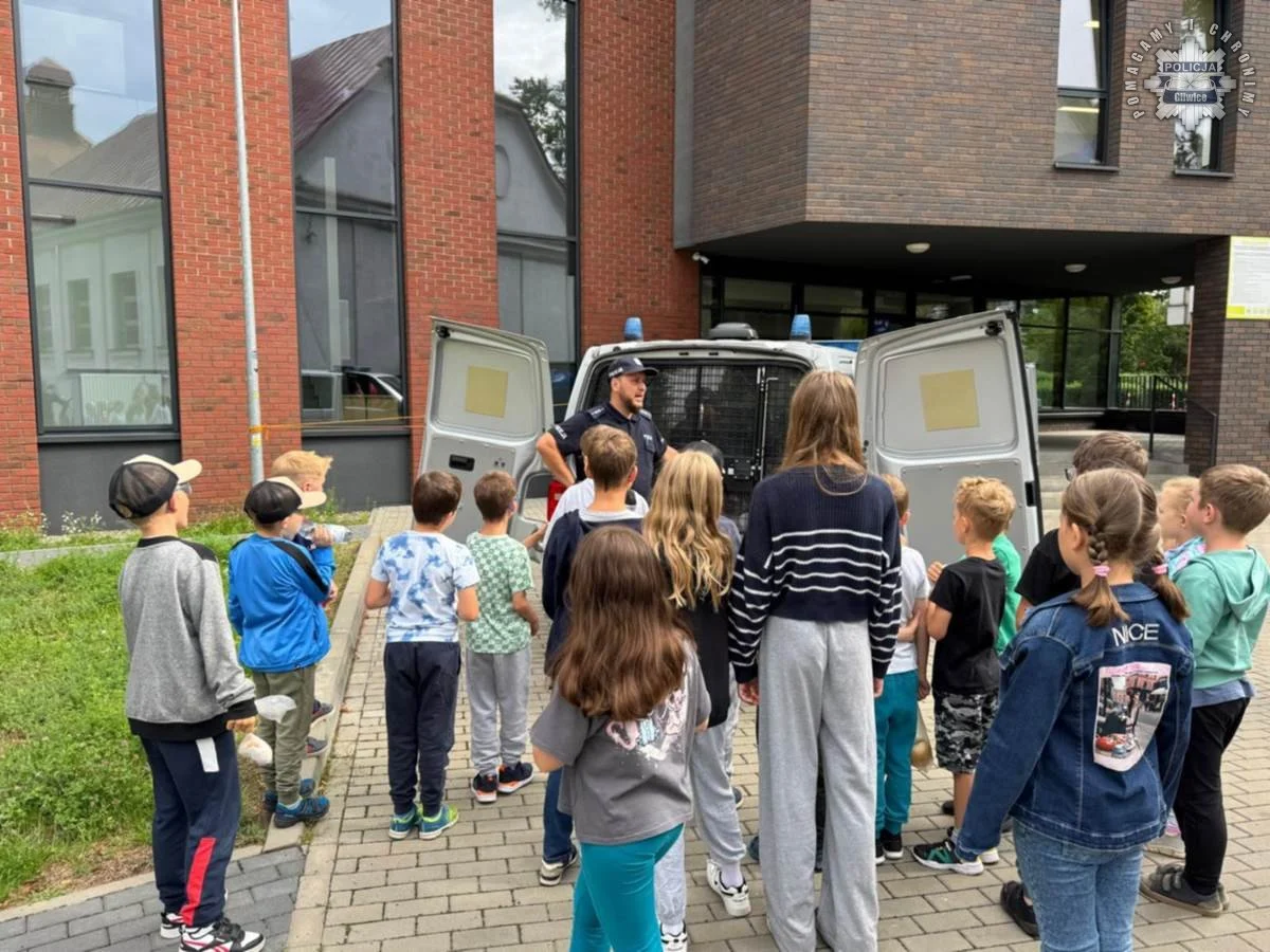 W ramach działań profilaktycznych „Bezpieczne wakacje 2025” gliwiccy policjanci spotkali się z uczestnikami półkolonii organizowanych w mieście. Zajęcia edukacyjne odbyły się w plenerze, gdzie dzieci w wieku od 3 do 6 lat miały okazję poznać funkcjonariuszy oraz zobaczyć z bliska oznakowany radiowóz policyjny.