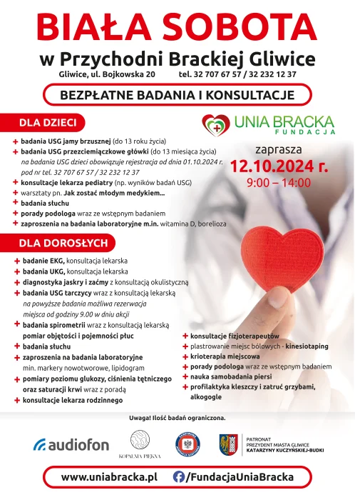 W Białą Sobotę Przychodni Brackiej, 12 października w godzinach od 9.00 do 14.00, w jednym miejscu, przy ul. Bojkowskiej 20, będzie można wykonać bezpłatnie podstawowe badania i skonsultować się ze specjalistami. Patronat nad wydarzeniem objęła prezydent Gliwic Katarzyna Kuczyńska-Budka.