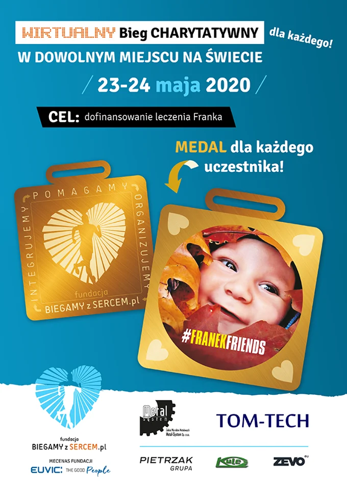 Każdy z tysiąca uczestników biegu otrzyma medal – wystarczy 23 lub 24 maja w dowolnej aktywności pokonać choć jeden kilometr i wesprzeć szczytny cel wpisowym w kwocie co najmniej 40 zł. Zebrana kwota będzie cegiełką wspierającą leczenie małego Franka, który cierpi na rdzeniowy zanikmięśni.
