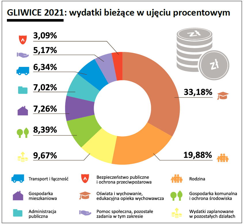 W naszym mieście dzięki rozsądnym działaniom w poprzednich latach zgromadzono pewną nadwyżkę budżetową, która pozwoliła, aby konieczne cięcia wydatków w 2021 roku były jak najmniej dotkliwe. Co ważne, miasto nie ograniczyło wydatków inwestycyjnych – te wręcz rosną w stosunku do roku ubiegłego. To element gliwickiej strategii walki ze skutkami kryzysu wywołanego COVID-19, w której publiczne inwestycje mogą stać się podporą dla lokalnych firm i uratować zagrożone miejsca pracy.
