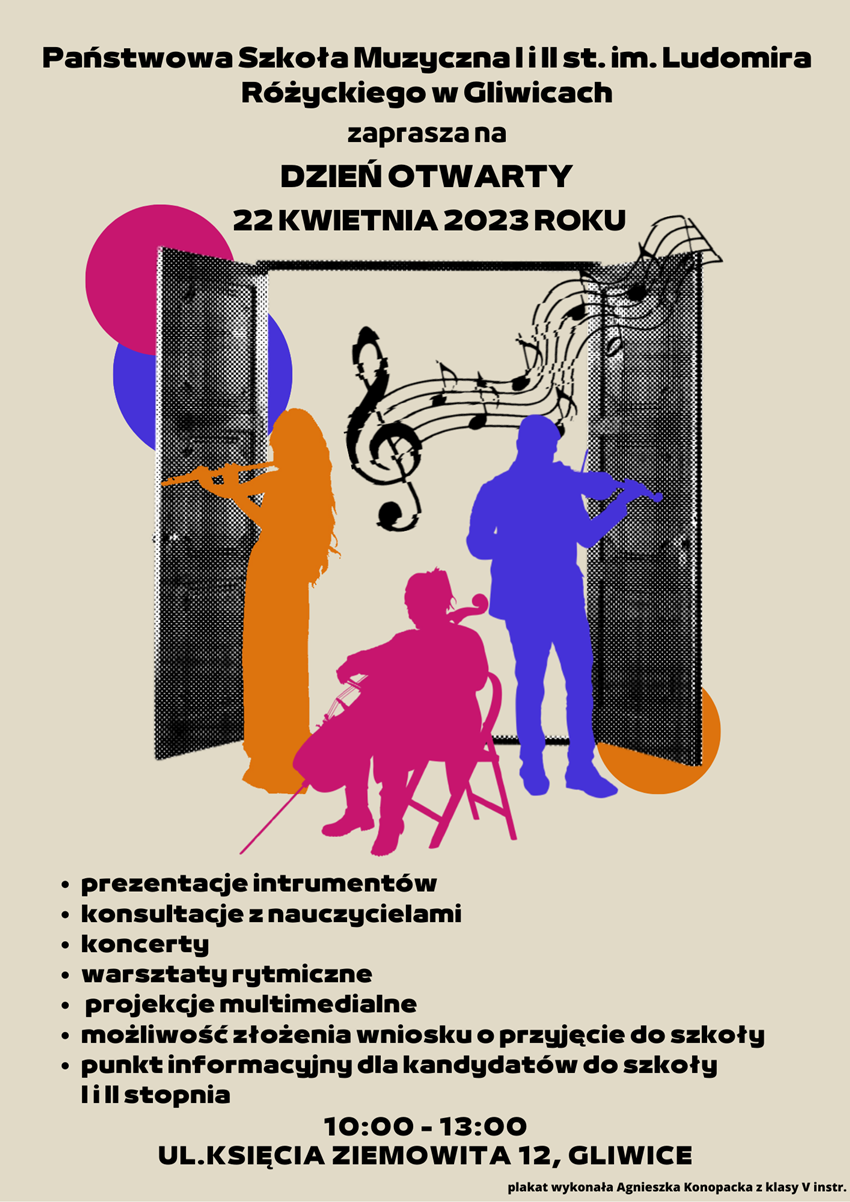 Serdecznie zaprasza się wszystkich na dzień otwarty Państwowej Szkoły Muzycznej I i II stopnia im. Ludomira Różyckiego w Gliwicach! Już 22 kwietnia od godziny 10 do godziny 13 w nowym budynku szkoły przy ulicy Księcia Ziemowita 12 odbędą się liczne atrakcje dla kandydatów do I i II stopnia.