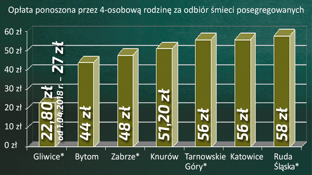 Zmiany stawek w Gliwicach nie są tak radykalne jak twierdzi burmistrz Ząbek, zwłaszcza gdy odniesiemy je do najbardziej nieszczelnego i obciążającego finansowo mieszkańców systemu pogłównego – wyjaśnia Edwin Górnicki. Z badań Szkoły Głównej Handlowej, których jest współautorem, wynika, że gliwiczanie płacą mniej za odbiór śmieci posegregowanych nie tylko w stosunku do mieszkańców Ząbek, ale i w skali opłat pobieranych na Górnym Śląsku (infografika poniżej). – W kategorii dwuosobowych i większych gospodarstw domowych na Górnym Śląsku Gliwice mają obecnie najtańszy i wzorcowy system pobierania opłat za odbiór śmieci posegregowanych – podsumowuje Edwin Górnicki.