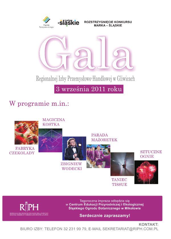 3 września br. środowisko biznesowe naszego regionu spotka się w Centrum Edukacji Przyrodniczej i Ekologicznej Śląskiego Ogrodu Botanicznego w Mikołowie, aby przy suto zastawionych stołach i niepowtarzalnej oprawie artystycznej, połączyć integrację z zabawą. Zgodnie z tradycją, Gala zgromadzi przedstawicieli najwyższych władz państwowych, korpusu dyplomatycznego, senatorów i posłów, przedstawicieli władz terytorialnych, gości z zagranicy i licznie przybyłych przedsiębiorców. Wzorem minionych lat, podczas części oficjalnej uroczystości, wraz z nagrodami "Marka – Śląskie" wręczone zostaną również odznaczenia regionalne, honorujące wyróżniających się działaczy gospodarczych oraz Medale Izby, które stanowią podziękowanie dla przedsiębiorstw za ich szczególne osiągnięcia w rozwoju regionu, ochronie środowiska i wprowadzaniu nowych rozwiązań i technologii.