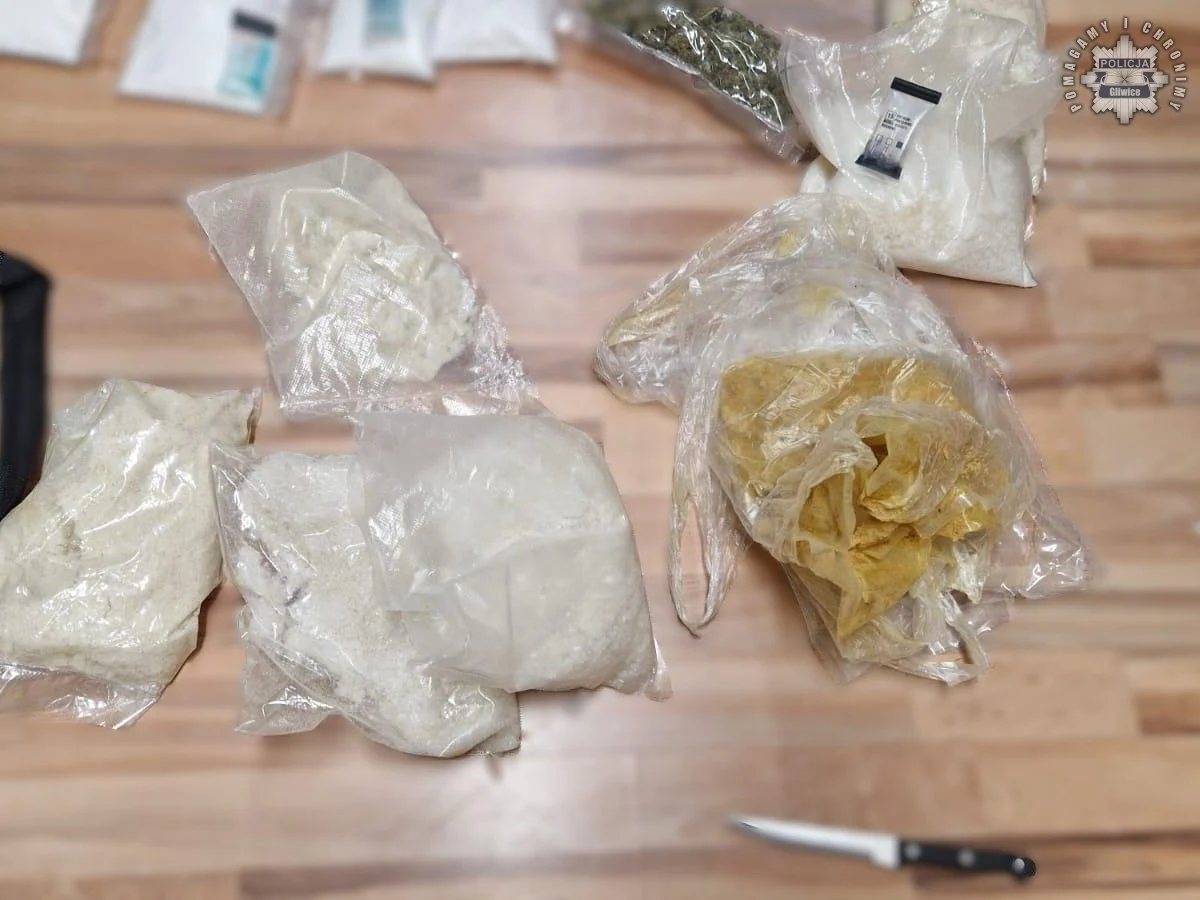 Dzięki skutecznej interwencji gliwickich funkcjonariuszy udało się zabezpieczyć znaczne ilości środków odurzających. Dwóch mężczyzn zostało zatrzymanych, a łączna waga przejętych narkotyków przekroczyła 23 kilogramy. Policjanci ujawnili m.in. amfetaminę, kokainę, metamfetaminę, MDMA, marihuanę oraz środki w formie tabletek i elektronicznych inhalatorów z THC. Sprawa jest rozwojowa.