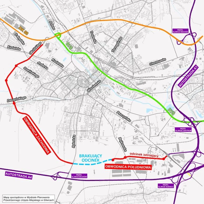 Po zbudowaniu drogi będzie można przejechać przez całą miejską obwodnicę o łącznej długości ponad 10 km. Przypomnijmy, że zbudowane zostały już wszystkie pozostałe części trasy: z jednej strony – od ul. Pszczyńskiej (od węzła autostradowego Gliwice Sośnica) do ul. Bojkowskiej, z drugiej – od al. Jana Nowaka-Jeziorańskiego (DK 88) do ul. Sowińskiego, od ul. Sowińskiego do ul. Daszyńskiego i dalej do ul. Rybnickiej.