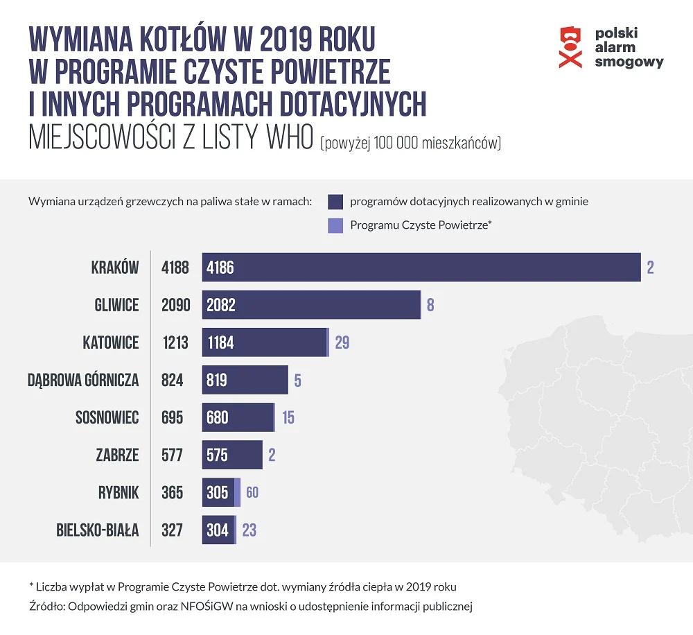 W województwie śląskim wśród miast z listy WHO powyżej 100 tys. mieszkańców w likwidacji kopciuchów przodują Gliwice (2090 wymienionych kotłów). Dalej są Katowice (1213), Dąbrowa Górnicza (824), Sosnowiec (695), Rybnik (365) i Bielsko-Biała (327). Na liście miejscowości liczących od 30 do 100 tys.mieszkańców znajduje się Wodzisław Śląski (284 wymienione kotły), Knurów (127) i Żywiec (75). Prześwietlono także sytuację w mniejszych miejscowościach województwa (do 30 tys. mieszkańców) z niechlubnej listy WHO, na której znalazła się Pszczyna (142 wymienione kotły) i Godów (15).