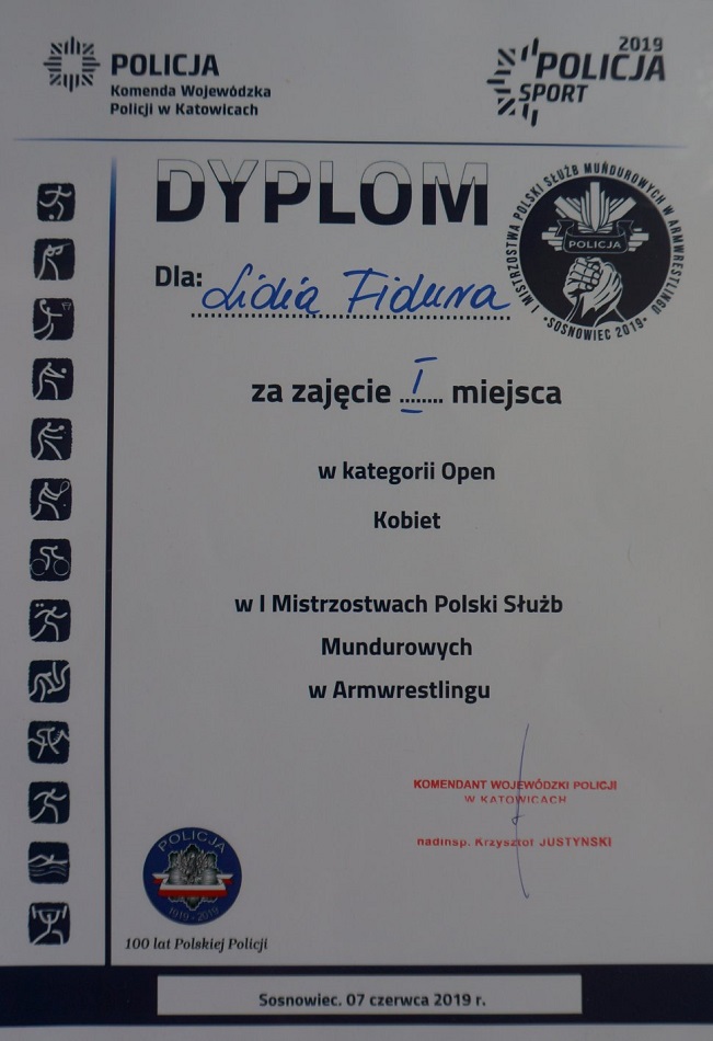 7 czerwca w ramach I Mistrzostwach Polski Służb Mundurowych w Armwrestlingu, w sali widowiskowo-koncertowej Muza w Sosnowcu spotkało się 39 najsilniejszych przedstawicieli służb mundurowych z wielu polskich miast. Wśród kobiet bezkonkurencyjna okazała się st. post. Lidia Fidura, która od przeszło dwóch lat służy w szeregach gliwickiej komendy. To znana zawodniczka, wielokrotna mistrzyni Polski w boksie, brązowa medalista igrzysk europejskich.