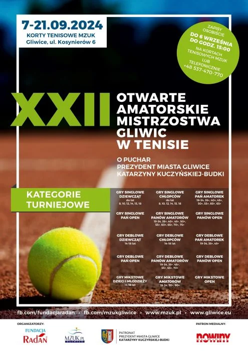 To już ostatni dzwonek, aby dołączyć do zawodników XXII Otwartych Amatorskich Mistrzostw Gliwic w Tenisie i zawalczyć o Puchar Prezydent Miasta Gliwice. Tenisiści – amatorzy, zgłoście się!
