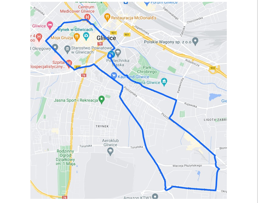 Trasa przebiegać będzie ulicami: Łużycka, Księdza Marcina Strzody, Prymasa Stefana Wyszyńskiego, Powstańców Warszawy, Jasnogórska, Jana Siemińskiego, Jana III Sobieskiego, Tadeusza Kościuszki, Nowy Świat, Pszczyńska, Bojkowska, Południowa Obwodnica Gliwic, Okrężna, Macieja Płażyńskiego, Pszczyńska, Panewnicka, Kujawska, rondo Akademickie, Łużycka, Plac Krakowski – zakończenie przejazdu w okolicach godziny 22.00
