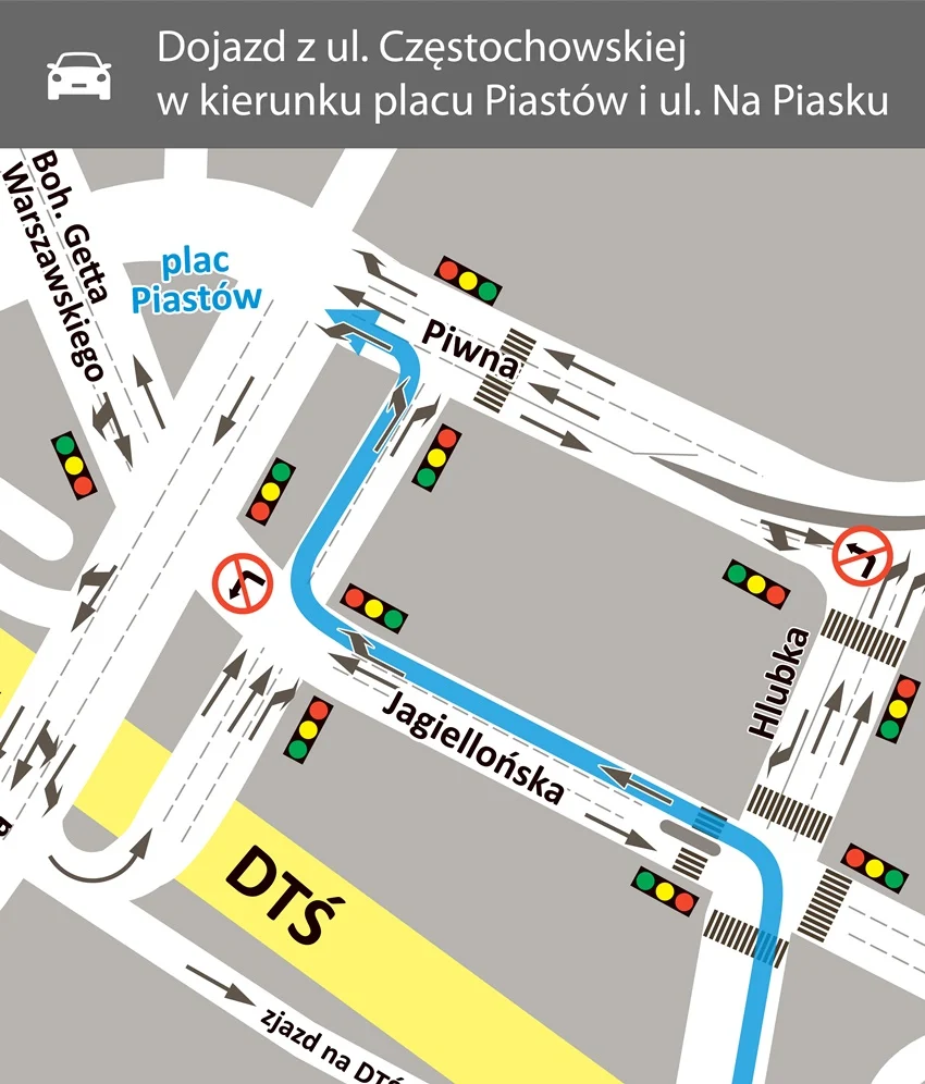 Aby dojechać z ul. Częstochowskiej w stronę placu Piastów, musimy skręcić w lewo w ul. Jagiellońską, na następnych światłach pojechać w prawo w uliczkę, którą wcześniej jeździły tylko autobusy (wzdłuż bloku mieszkalnego) i potem skręcić w lewo w ul. Piwną.