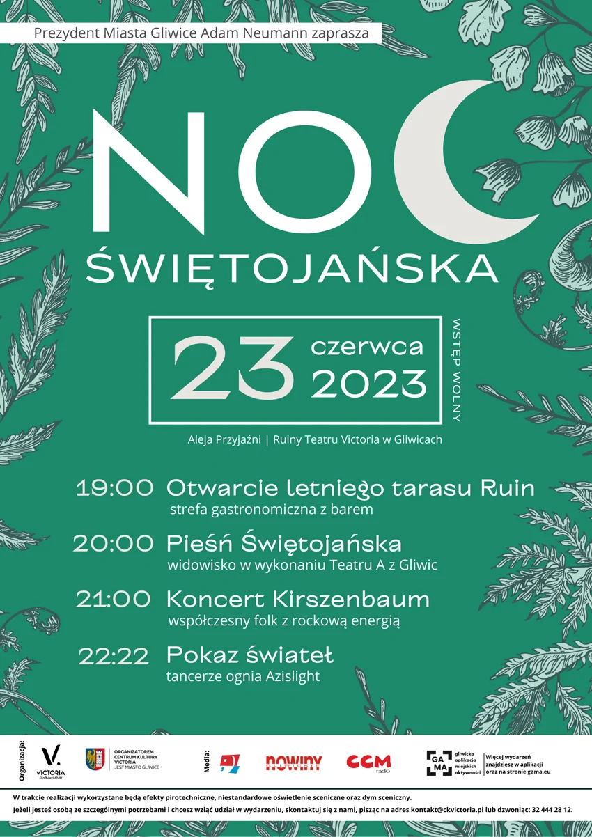 Wstęp na wszystkie atrakcje w ramach Nocy Świętojańskiej jest bezpłatny. Na wydarzenie zapraszają prezydent Gliwic Adam Neumann oraz Centrum Kultury Victoria. Więcej informacji można znaleźć na stronie internetowej ckvictoria.pl.