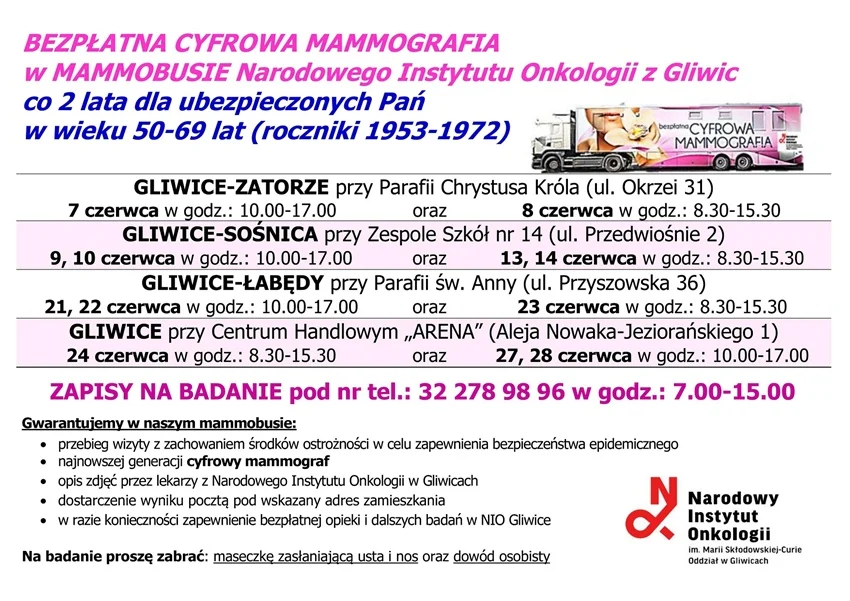 W czerwcu w Gliwicach odbędzie się akcja Darmowych Badań Mammograficznych, z których mogą skorzystać panie w wieku 50-69 lat. Mammobus Narodowego Instytutu Onkologii z Gliwic zawita do Zatorza, Sośnicy i Łabęd. Pojawi się też przy Centrum Handlowym Arena.