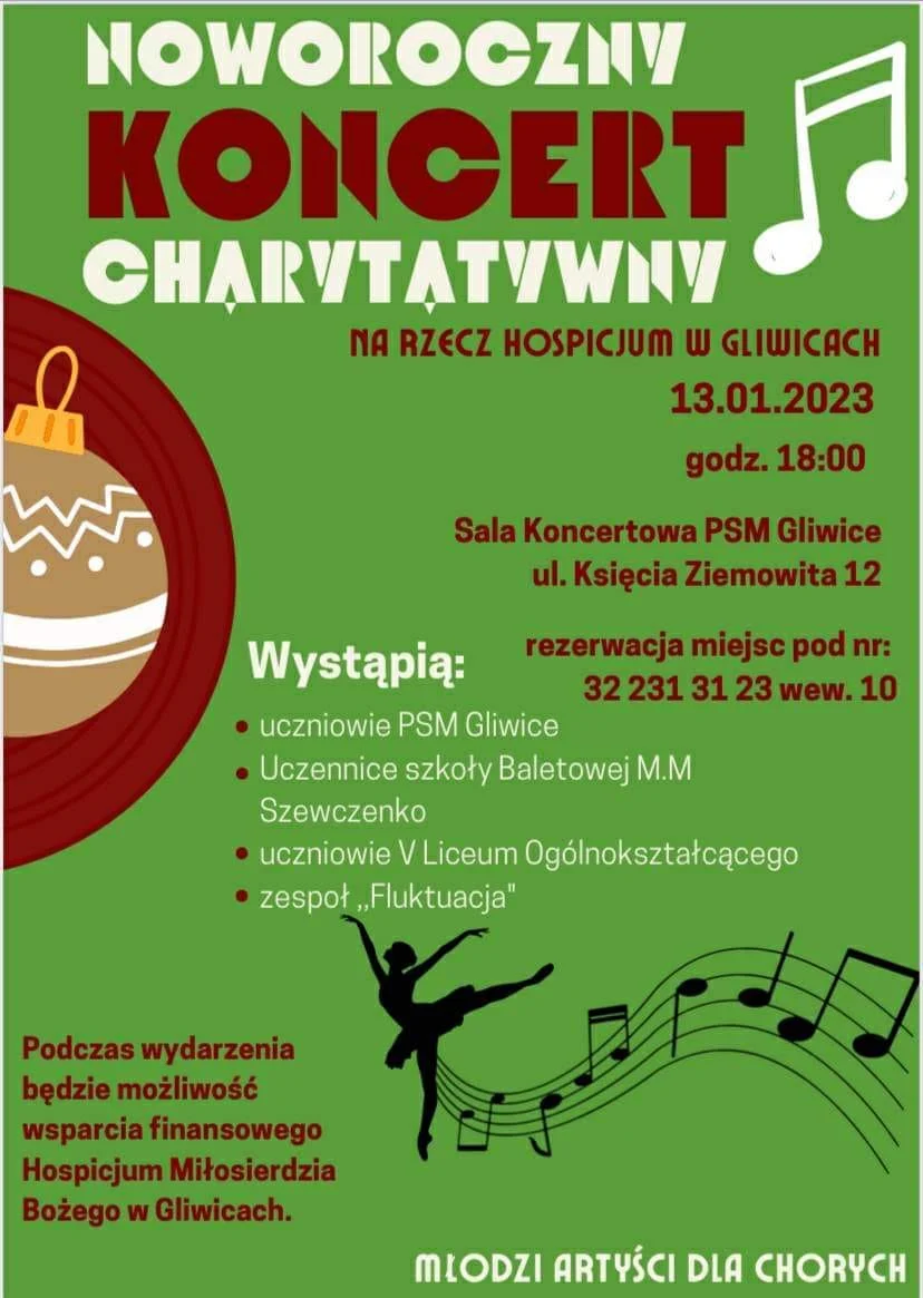 W piątek, 13 stycznia, o godz. 19.30 w Państwowej Szkole Muzycznej im. Ludomira Różyckiego przy ul. Ziemowita 12 rozpocznie się koncert charytatywny na rzecz Hospicjum Miłosierdzia Bożego w Gliwicach.