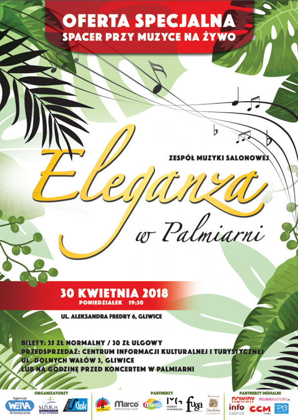 Walce i czardasze pod palmami? Czemu nie! 30 kwietnia Zespół Muzyki Salonowej Eleganza wykona koncert w bardzo egzotycznej scenerii. Spotykamy się w Palmiarni Miejskiej (park Chopina, ul. Fredry 6) o godz. 19.30!