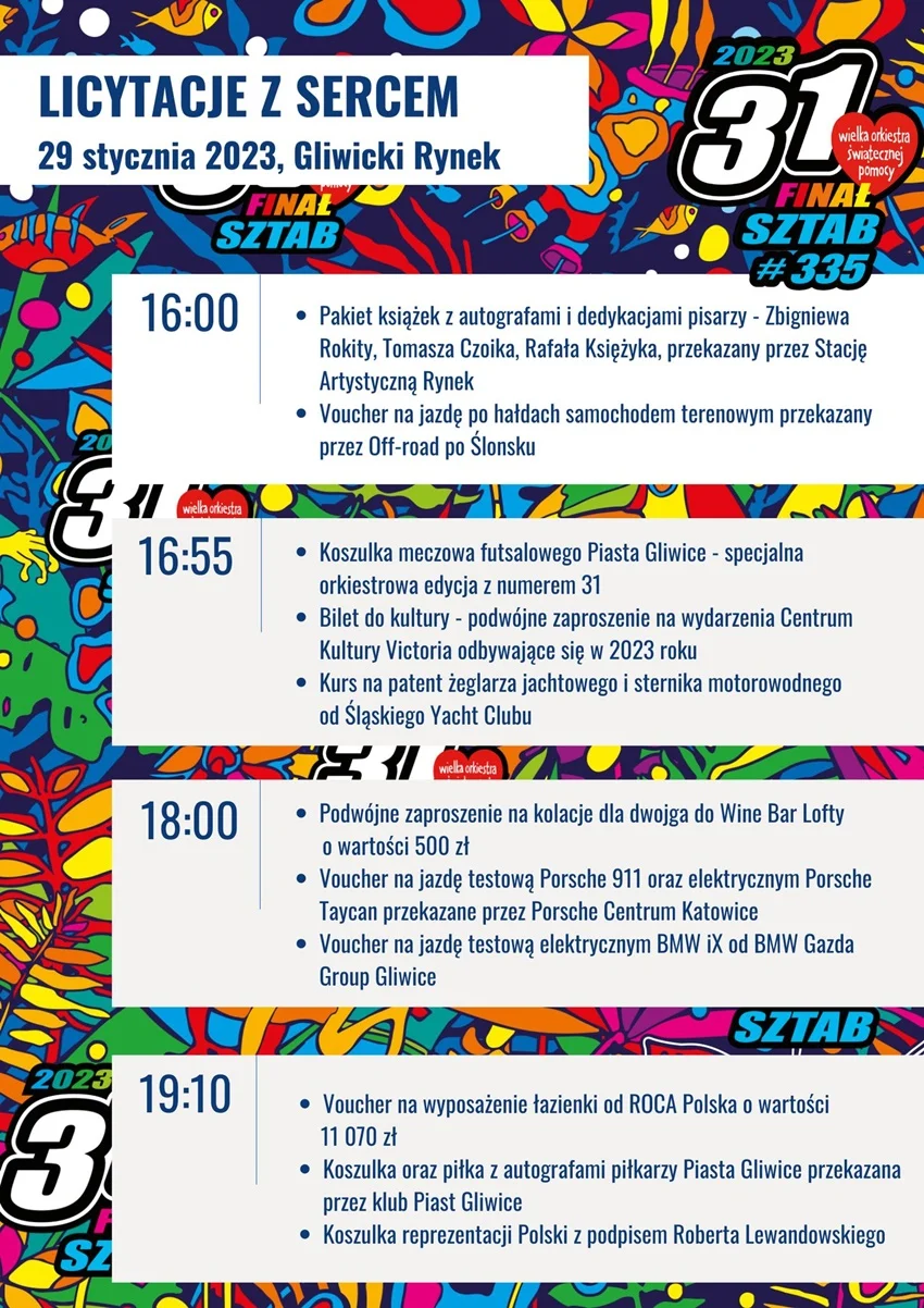 Do zdobycia będzie m.in. koszulka Reprezentacji Polski z podpisem Roberta Lewandowskiego. Tegoroczne licytacje w ramach 31. Finału WOŚP na gliwickim Rynku rozpoczną się równolegle z koncertami, o godz. 16.00 i będą się odbywać na dużej scenie, pomiędzy występami artystów. Polowanie na wymarzone fanty ułatwi harmonogram licytacji przekazany przez organizatorów.