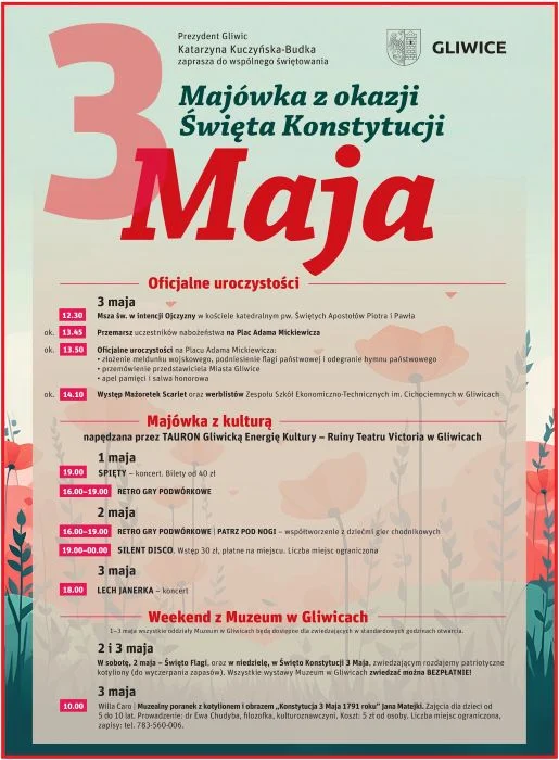 Aby uczcić 235. rocznicę tego ważnego wydarzenia, 3 maja warto przyozdobić domy biało-czerwonymi flagami oraz wziąć udział w miejskich obchodach. W Gliwicach tradycyjnie rozpocznie je msza święta w intencji Ojczyzny, która o godz. 12.30 zostanie odprawiona w kościele katedralnym pw. Świętych Apostołów Piotra i Pawła. Po nabożeństwie, ok. godz. 13.45, uczestnicy przemaszerują wspólnie na Plac Adama Mickiewicza, gdzie o godz. 13.50 rozpoczną się oficjalne uroczystości. Wydarzenie zwieńczy, ok. godz. 14.10, występ Mażoretek Scarlet oraz werblistów Zespołu Szkół Ekonomiczno-Technicznych im. Cichociemnych w Gliwicach.
