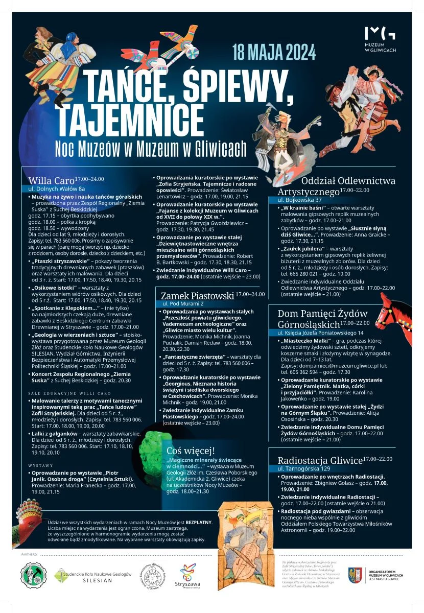 Tegoroczna Noc Muzeów odbędzie się w naszym mieście pod hasłem „Tańce śpiewy, tajemnice”, a atrakcje zaplanowano we wszystkich oddziałach gliwickiego Muzeum: w Willi Caro, Domu Pamięci Żydów Górnośląskich, Radiostacji Gliwice, Oddziale Odlewnictwa Artystycznego i Zamku Piastowskim. Będzie w czym wybierać!