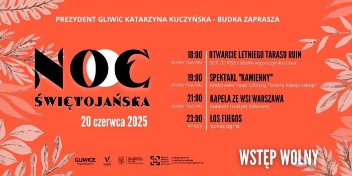20 czerwca władze miasta zapraszają do Gliwic na niezapomnianą Noc Świętojańską – pełną dźwięków ognia i sztuki w najlepszym wydaniu. Przed nami m.in. spektakl Teatru Ulicznego Scena Kalejdoskop i koncert Kapeli ze Wsi Warszawa. A to nie wszystko! Sprawdźcie szczegóły i świętujmy razem najkrótszą noc w roku. Wstęp wolny.