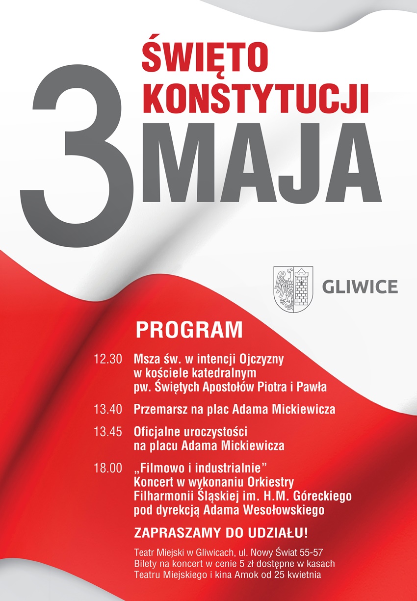 Z okazji 232. rocznicy tego ważnego wydarzenia już w najbliższą środę warto przyozdobić domy biało-czerwonymi flagami, a także wziąć udział w obchodach miejskich. W Gliwicach rozpoczną się one mszą świętą o godz. 12.30 w kościele katedralnym pw. Świętych Apostołów Piotra i Pawła. Ok. 13.40 nastąpi przemarsz na pl. Mickiewicza, gdzie odbędą się oficjalne uroczystości.