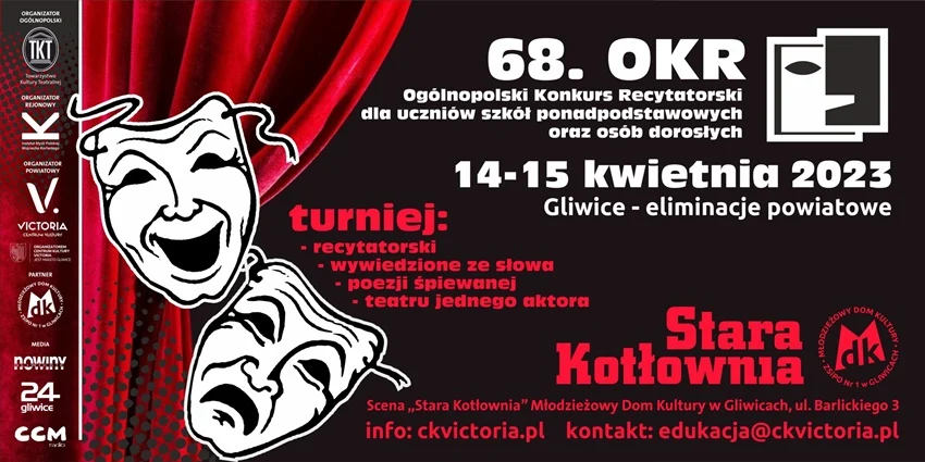 Centrum Kultury Victoria przekazuje informację, że po wielu latach przerwy do Gliwic wracają eliminacje powiatowe Ogólnopolskiego Konkursu Recytatorskiego dla młodzieży i dorosłych.