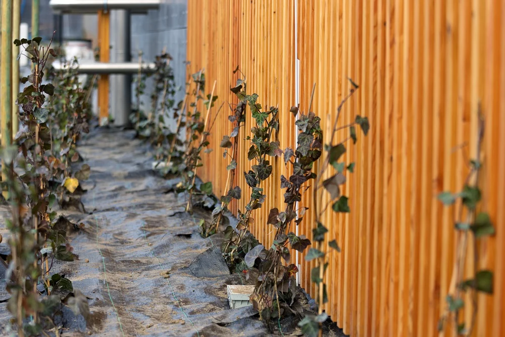 Ponad 400 sadzonek pnączy, zarówno zimozielonego bluszczu, jak i szkarłatnie przebarwiającego się jesienią winobluszczu, dostrzeżemy wzdłuż długiej ściany oporowej oddzielającej Centrum Przesiadkowe od kamieniczek z ul. Kolberga. Pnącza świetnie poradzą sobie w sąsiedztwie betonowych murów i drewnianych okładzin, są bowiem wyjątkowo żywotne i nie wymagają dodatkowej, kosztownej pielęgnacji. Dzięki intensywnemu wzrostowi szybko pokryją powierzchnię ściany, stając się naturalnym ekranem dźwiękochłonnym, filtrem powietrza i regulatorem temperatury otoczenia. Dodatkowo będą doskonałym, ekologicznym uzupełnieniem centralnego fragmentu muru, który wyłożono płytami betonowymi na bazie cementu fotokatalitycznego. Ten pod wpływem światła słonecznego oczyszcza powietrze, neutralizując szkodliwe substancje i zamieniając je w rozpuszczalne, spłukiwane przez deszcz sole o składzie przypominającym nawóz do kwiatów. Dodatkowo cement fotokatalityczny jest materiałem antybakteryjnym, dzięki czemu na płytach nie rozwiną się grzyby czy pleśń.