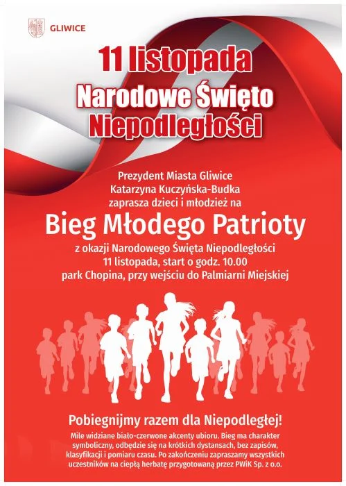11 listopada w Gliwicach odbędą się tradycyjne obchody Narodowego Święta Niepodległości. Tegoroczne uroczystości zainauguruje Bieg Młodego Patrioty, do którego zapraszamy wszystkie chętne dzieci i młodzież.