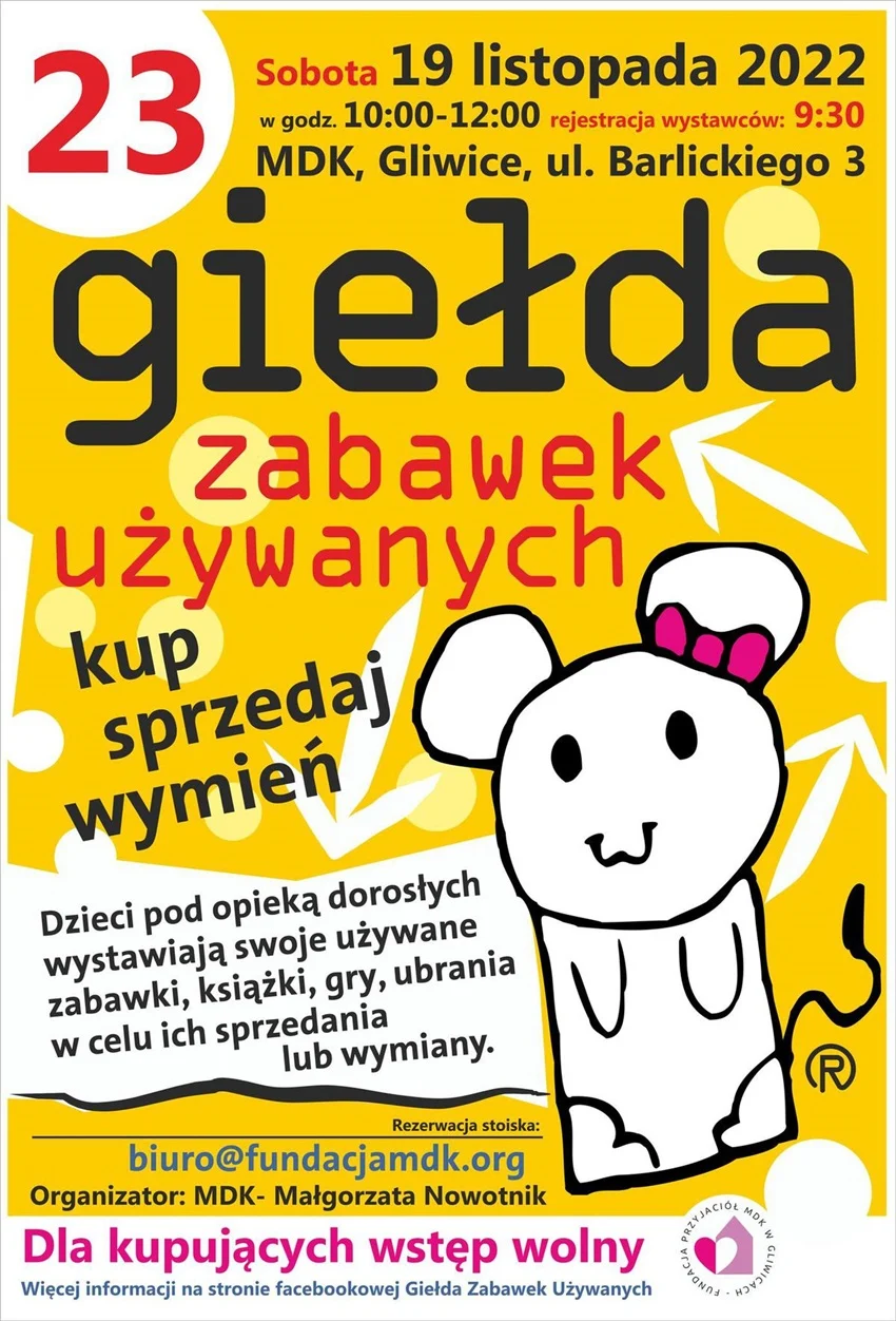 23. Giełda Zabawek Używanych odbędzie się w sobotę, 19 listopada, w godz. od 10.00 do 12.00 w Młodzieżowym Domu Kultury przy ul. Barlickiego 3.