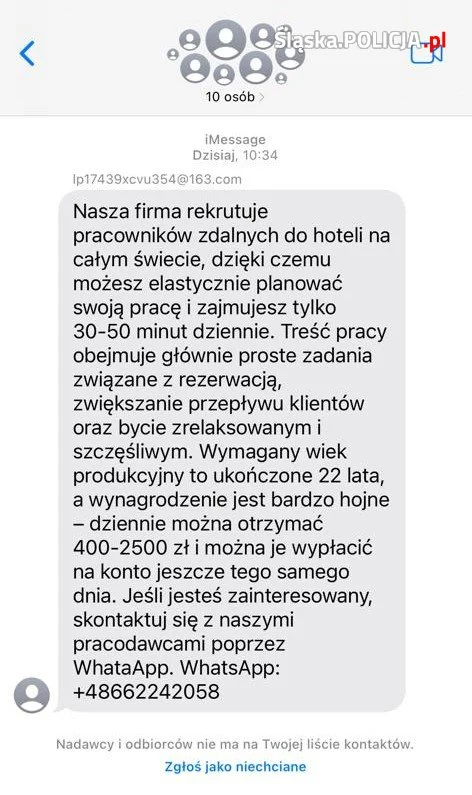Apelujemy o ostrożność i zdrowy rozsądek. Wyjątkowo atrakcyjna oferta pracy, oferowana w wiadomości SMS-owej czy mailowej, najczęściej jest oszustwem. – czytamy na stronie policji.