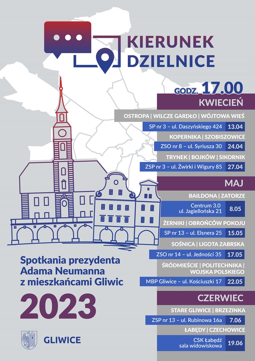 “Kierunek Dzielnice” to kontynuacja spotkań z ubiegłego roku. Dzięki bezpośredniemu dialogowi z mieszkańcami i przekazywanym przez nich konkretnym informacjom onajbliższej okolicy, władze miasta mogą skuteczniej realizować i planować poszczególne zadania, odpowiadając na dzielnicowe potrzeby, a mieszkańcy Gliwic mogą uzyskać ważne informacje o interesujących ich sprawach czy możliwości i perspektywie rozwiązania konkretnych problemów. To doskonała okazja, by porozmawiać o działaniach pozwalających podnieść jakość życia w naszym mieście.