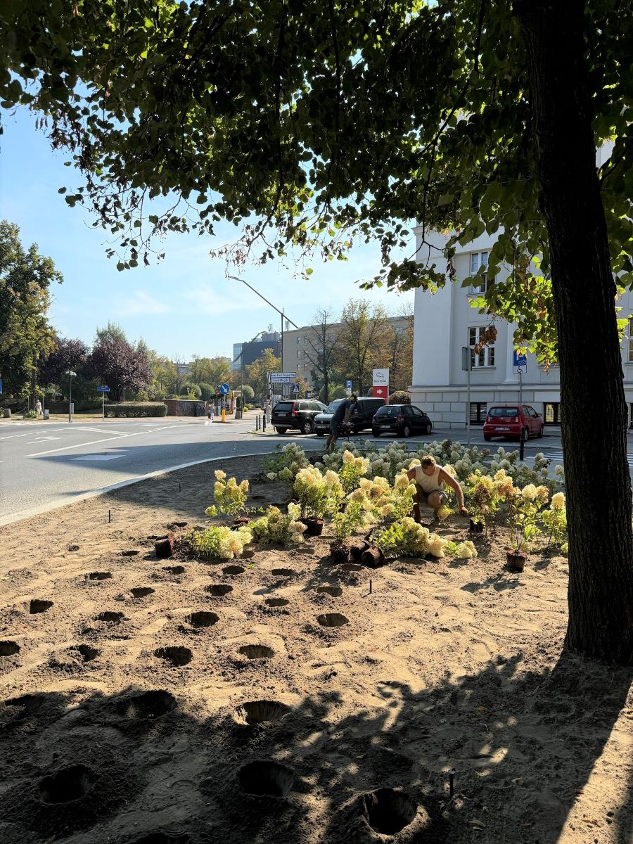 Kwitnące hortensje bukietowe, bodziszki korzeniaste i zawilce japońskie są już pieczołowicie nasadzane na niedawno odbrukowanym, nowym 200-metrowym zieleńcu vis-à-vis placu Piłsudskiego, w rejonie skrzyżowań z ulicami Berbeckiego i Gruszczyńskiego. Do lipca w tym miejscu znajdował się asfalt i powierzchnia wyłączona z ruchu.