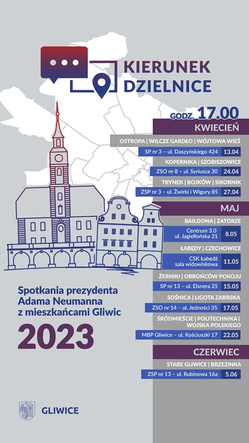 Spotkania będą odbywać się głównie w szkołach, a także m.in. w Miejskiej Bibliotece Publicznej, siedzibie Centrum 3.0 – Gliwickiego Ośrodka Działań Społecznych (Strefie Aktywności Społecznej) i Centrum Sportowo-Kulturalnym Łabędź. Każdy będzie mógł zabrać głos w dyskusji na temat dzielnic, których dotyczy spotkanie.