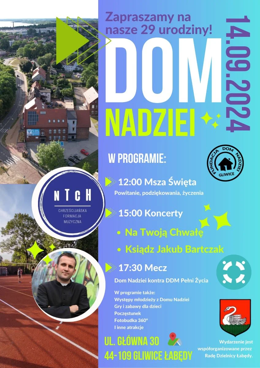 Wspólne świętowanie rozpocznie msza święta, która zostanie odprawiona o godz. 12.00. Z kolei godz. 15.00 rozpoczną się koncerty – na scenie wystąpi chrześcijańska formacja muzyczna Na Twoją Chwałę oraz ksiądz Jakub Bartczak. Natomiast na godz. 17.30 zaplanowano mecz piłkarski, w którym drużyna Domu Nadziei zmierzy się ze składem DDM Pełni Życia.