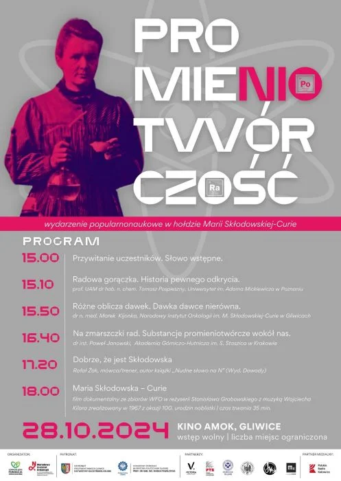 Konferencja, której celem jest oddanie hołdu wybitnej uczonej – patronce Narodowego Instytutu Onkologii w Gliwicach, zaprasza w godz. 15.00–18.00 do świata nauki, przekazując wiedzę na temat zjawiska promieniotwórczości w sposób fascynujący, a zarazem łatwy i zrozumiały.