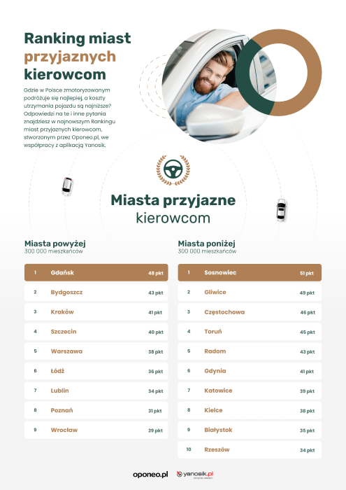 Miasta biorące udział w rankingu organizowanym przez Oponeo.pl we współpracy z aplikacją Yanosik rywalizowały w dwóch grupach: powyżej oraz poniżej 300 tys. mieszkańców. Gliwice, które w 2020 roku zwyciężyły w zestawieniu, tym razem uplasowały się na 2. miejscu w grupie 10 miast poniżej 300 tys. mieszkańców.