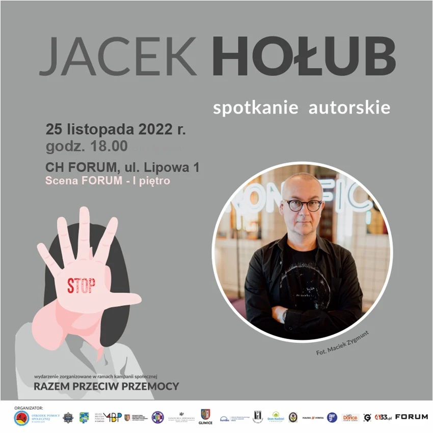 Jacek Hołub – dziennikarz, z wykształcenia politolog i PR-owiec, współpracownik portalu Niepełnosprawni.pl i magazynu „Integracja”. Przez kilkanaście lat był dziennikarzem „Gazety Wyborczej”. Autor wielokrotnie nagradzanych książek podejmujących trudne tematy: Żeby umarło przede mną. Opowieści matek niepełnosprawnych dzieci, Niegrzeczne. Historie dzieci z ADHD, autyzmem i zespołem Aspergera, Beze mnie jesteś nikim. Przemoc w polskich domach oraz współautor reporterskiej biografii dyrektora Radia Maryja Imperator. Sekrety ojca Rydzyka. Książka Beze mnie jesteś nikim zajęła trzecie miejsce w plebiscycie serwisu Lubimyczytać.pl na najlepsze książki 2021 roku w kategorii Literatura faktu, publicystyka. Natomiast Żeby umarło przede mną m. in. znalazła się w finale Nagrody „Newsweeka” im. Teresy Torańskiej i zdobyła nominacje do Kryształowej Karty Polskiego Reportażu. Na jej podstawie w Bałtyckim Teatrze Dramatycznym w Koszalinie powstał także spektakl o tym samym tytule. Wydarzenie zorganizowane w ramach kampanii „Razem przeciw przemocy”.