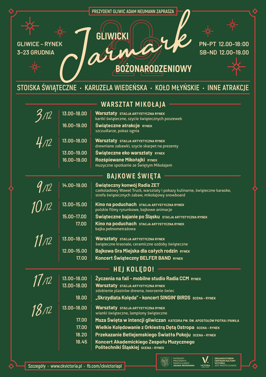 Na odwiedzających starówkę czekać będzie 20 stoisk oferujących m.in. ręcznie wykonane dekoracje świąteczne, ceramikę, zabawki, kosmetyki, słodycze, wędliny i potrawy na wigilijny stół. Stragany będą czynne od poniedziałku do piątku w godz. 12.00–18.00 oraz w sobotę i niedzielę w godz. 12.00–19.00. Oprócz nich na płycie Rynku stanie też tradycyjna bożonarodzeniowa szopka, rozświetlona karuzela wiedeńska, drewniana wieża serwująca aromatyczne grzane wino, świąteczna fotobudka oraz tegoroczna nowość – diabelski młyn, z którego goście będą mogli podziwiać panoramę Gliwic.
