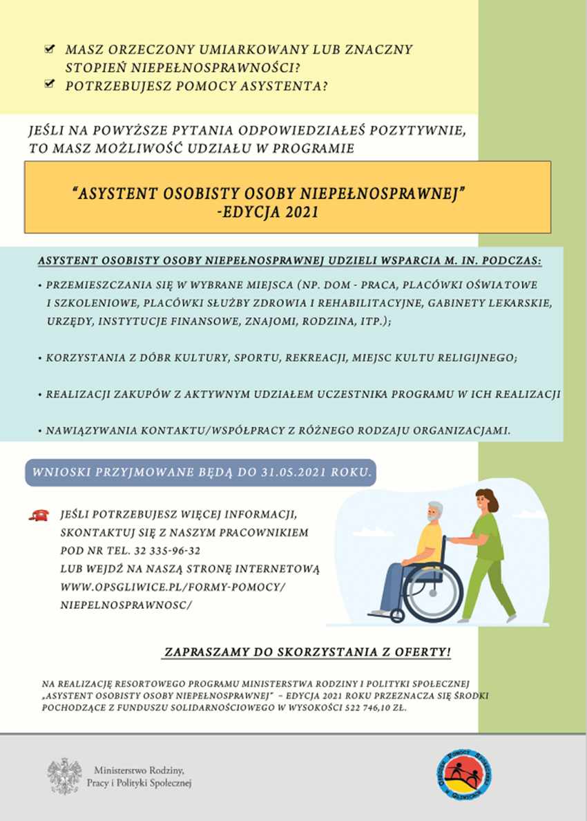 Zaprasza się pełnoletnich mieszkańców Gliwic, legitymujących się znacznym lub umiarkowanym stopniem niepełnosprawności (orzeczeniem równoważnym) chcących skorzystać z programu do składania wniosków. Wnioski przyjmowane będą do 31 maja 2021 r.