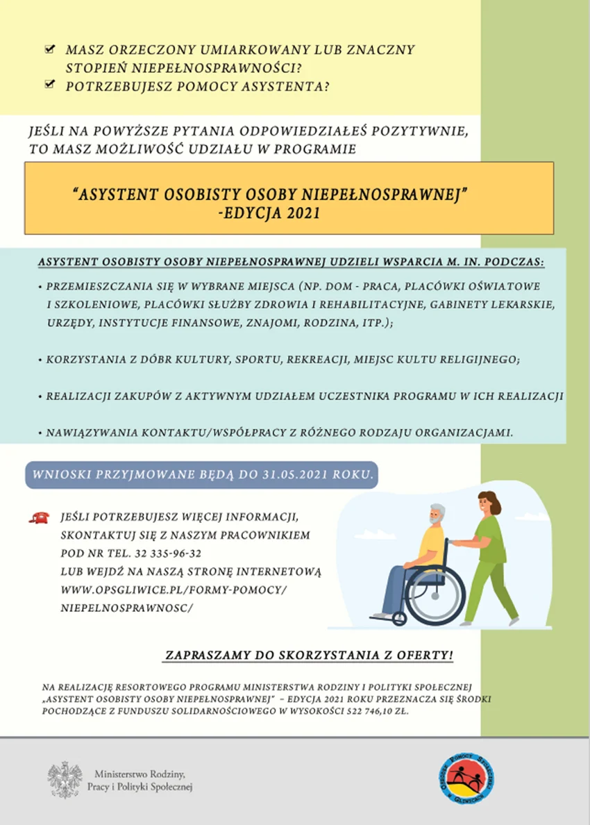 Program finansowany jest ze środków Funduszu Solidarnościowego, wartość otrzymanego dofinansowania wynosi 522 746,10 zł. Szczegółowe informacje znajdują się na stronie www.opsgliwice.pl/formy-pomocy/niepelnosprawnosc/asystent-osobisty-osoby-niepelnosprawnej.