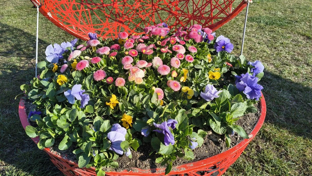 Na skwerze ustawiono pisanki w kolorze białym, żółtym i czerwonym. Każda z nich została wypełniona wiosennymi kwiatami, dzięki czemu dekoracje przyciągają wzrok mieszkańców i przechodniów.