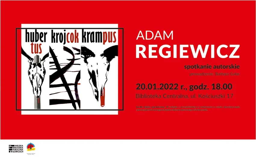 Zaprasza się na spotkanie z Adamem Regiewiczem, autorem powieści kryminalnych, mi.in najnowszej (2021r.) trylogii zabrzańskiej „Hubertus, Krojcok, Krampus”. Spotkanie poprowadzi Barbara Gołas.