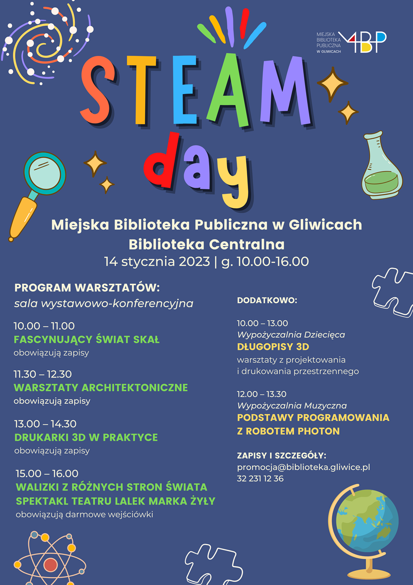 Gliwicka biblioteka zaprasza 14 stycznia do Biblioteki Centralnej na STEAM DAY – całodniowe wydarzenie poświęcone nauce, technologii, inżynierii, sztuce oraz matematyce. W tym dniu czekać będzie na Was szereg warsztatów, które rozbudzą wyobraźnię i kreatywne myślenie. Uczestnicy będą mieli okazję poznać tajniki druku 3D z wykorzystaniem drukarek i długopisów oraz podstawy programowania z robotami Photon.