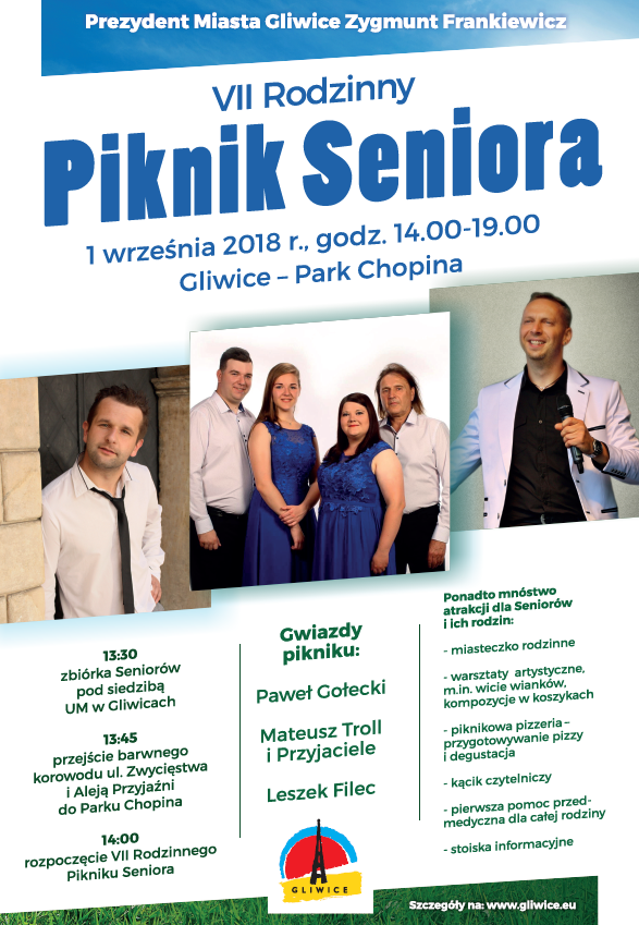 Impreza zakończy się w godzinach wieczornych, około 19.00. Wstęp wolny! Organizatorem Pikniku Seniora jest Miasto Gliwice.