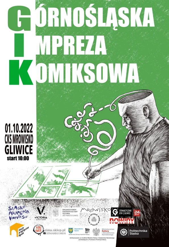 GIK czyli Górnośląska Impreza Komiksowa to długo wyczekiwana pierwsza edycja święta komiksu na Śląsku. Festiwal zgromadzi twórców, wydawców, badaczy i miłośników komiksów. Edycja 2022 odbędzie się w przestrzeni Klubu Studenckiego „Mrowisko” w Gliwicach, a wystawa towarzysząca imprezie w Stacji Artystycznej Rynek.
