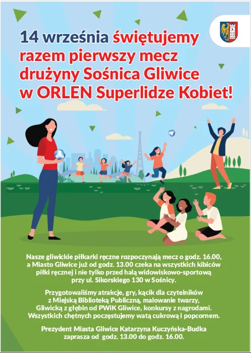 W sobotę, 14 września atrakcje będą czekać na gości w godz. od 13.00 do 16.00, przed halą widowiskowo-sportową przy ul. Sikorskiego 130 w Sośnicy. Wydarzenie poprzedzi pierwszy mecz naszych piłkarek ręcznych w ORLEN Superlidze Kobiet, który rozpocznie się o godz. 16.00.