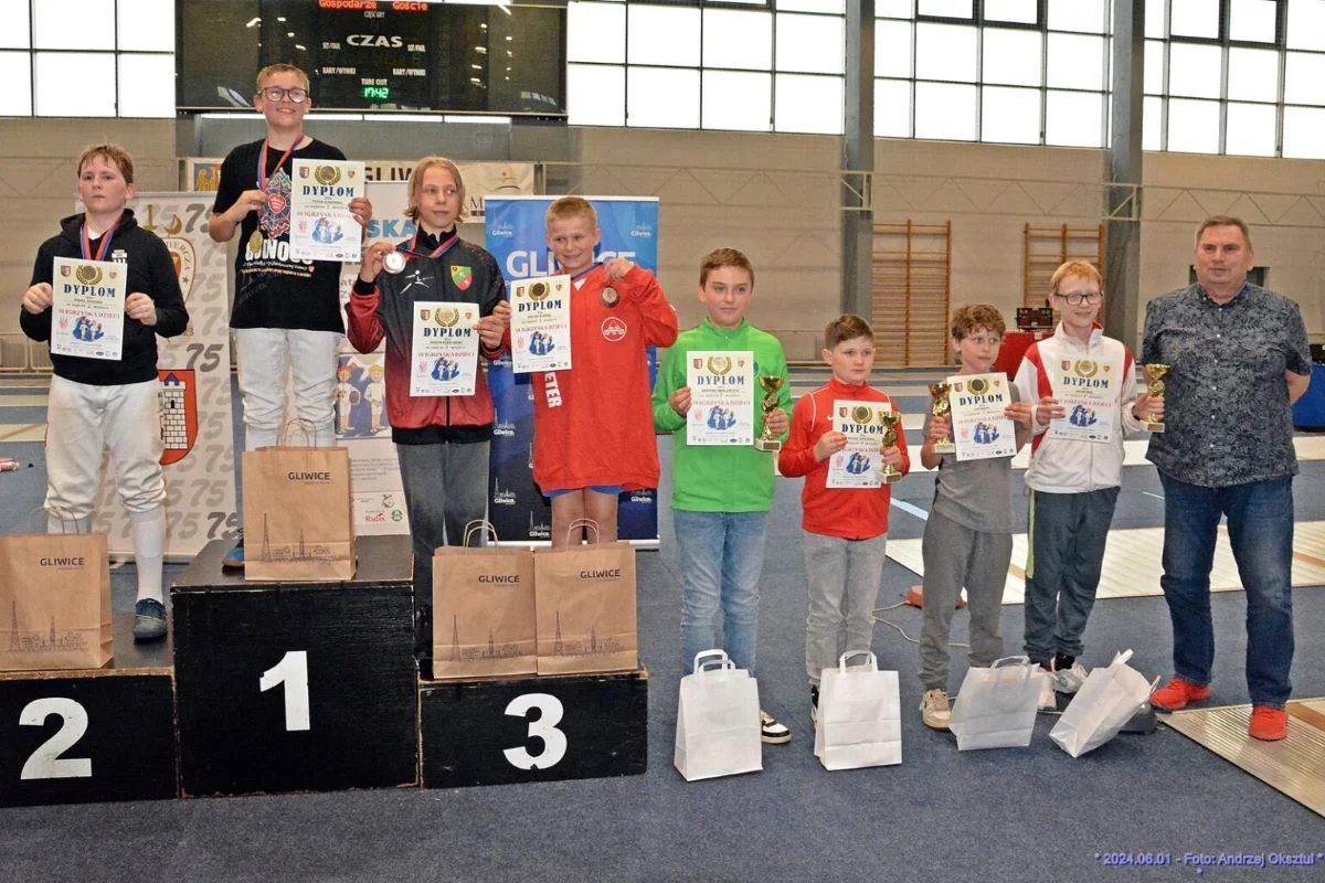 Spośród chłopców najlepszy okazał się Tytus Kurowski – aktualnie najlepszy szermierz w Polsce walczący w kategorii dzieci, który w tym sezonie zwyciężył już w pięciu punktowanych turniejach, w tym w trzech organizowanych w Gliwicach. Tym razem jednak jego droga do finału nie była łatwa. W ćwierćfinale Kurowski nieznacznie pokonał Bartosza Smolarczyka z klubu Kosynier Gliwice 10:6. W półfinale jeszcze wyżej poprzeczkę zawiesił Hugon Kobylański z AZS AWF Wrocław, który przegrał z gliwiczaninem jedynie dwoma trafieniami 8:10. Emocje sięgnęły zenitu w finale, w którym gliwiczanin zwyciężył zaledwie jednym trafieniem, jednak udowodnił, że w tym sezonie nie ma na niego mocnych. W tej samej kategorii dobrze zaprezentował się też Wiktor Pakosz. Szermierz Muszkietera Gliwice zakończył turniej na 3. miejscu.