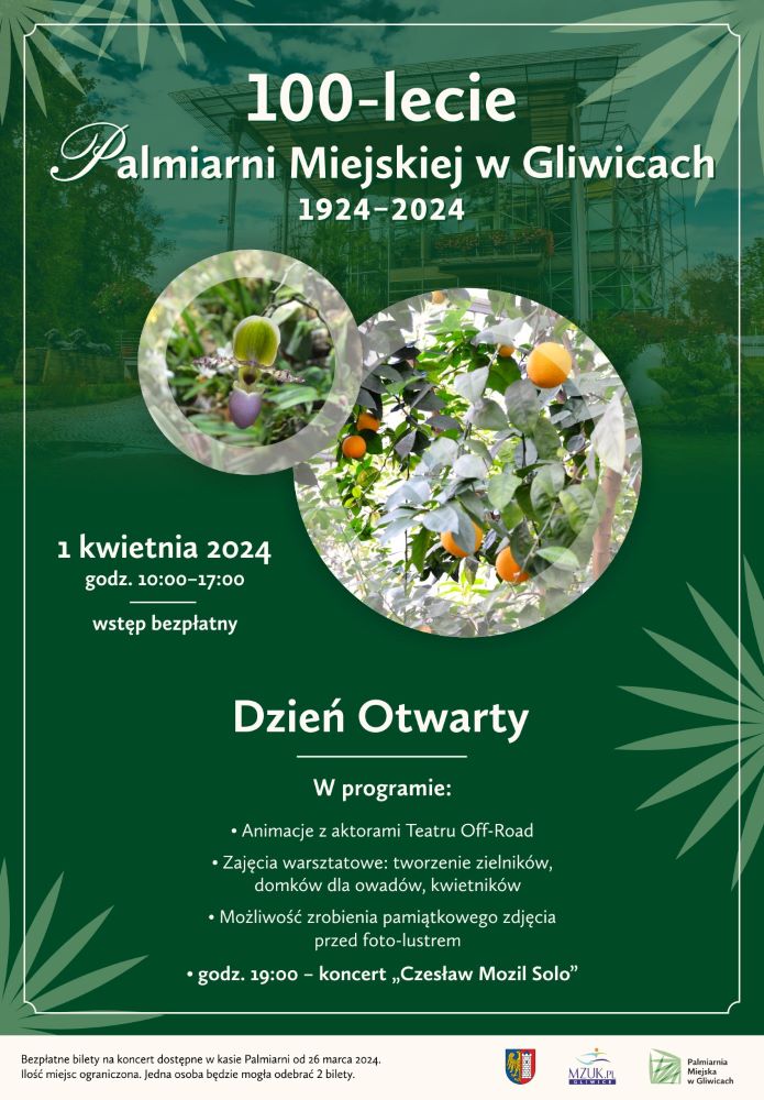 - Godz. 19.00. W altance pawilonu historycznego odbędzie się koncert „Czesław Mozil solo”. Obowiązują bezpłatne wejściówki, które będzie można odebrać w kasie Palmiarni od 26 marca. Jedna osoba może odebrać dwa bilety. Do rozdania jest 160 wejściówek: 80 od godz. 10.00 i kolejne 80 od godz. 16.00.