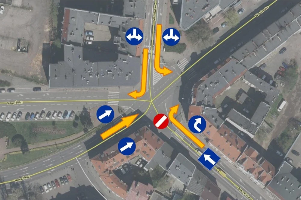 - Nie ma możliwości skrętu w prawo z ulicy Nowy Świat do ul. Pszczyńskiej. Kierowcy jadą objazdem ulicami: Wrocławską, Łużycką, Kujawską i Panewnicką do ulicy Pszczyńskiej.