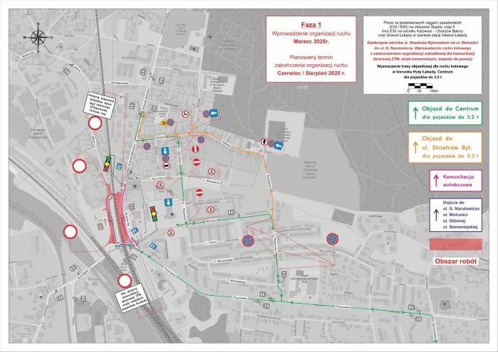 Dla ograniczenia ruchu tranzytowego przez osiedla mieszkaniowe, dla pojazdów jadących od strony Pyskowic zalecany jest objazd w kierunku Specjalnej Strefy Ekonomicznej przez ul. Toszecką i Pionierów do DK 88. Samochody ciężarowe powinny korzystać z objazdu przez ulice Toszecką i Czołgową.